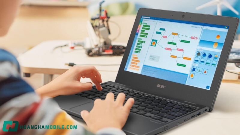 Về chất liệu và độ bền, chiếc máy tính xách tay này được chế tạo từ nhựa cứng cáp, có khả năng chịu được các va đập nhẹ, đảm bảo an toàn cho máy trong quá trình sử dụng và di chuyển.