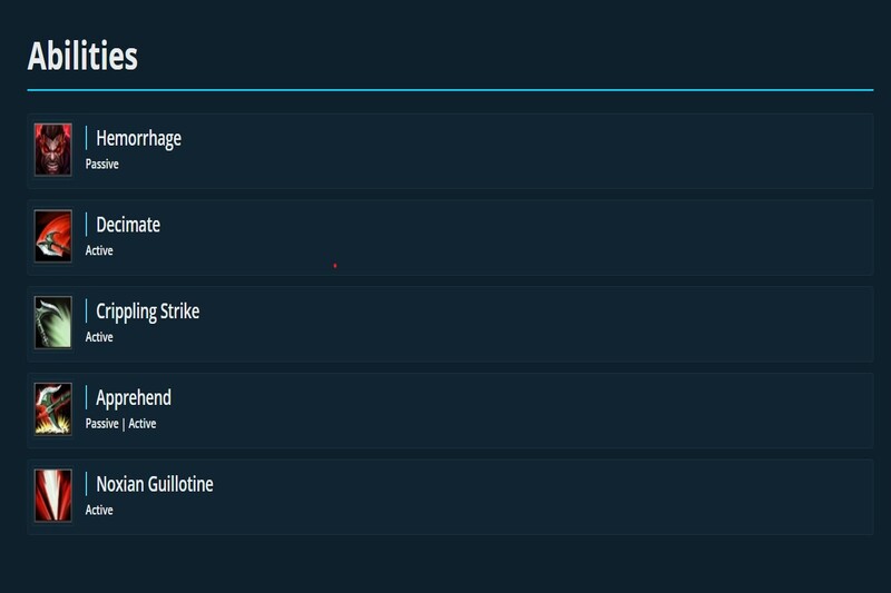 Kỹ năng Xuất Huyết: Darius gây sát thương trong mỗi cú đánh với hiệu ứng chảy máu. Hiệu ứng này sẽ gây nên 12 + 30% sát thương vật lý được cộng thêm trong 5 giây. Darius có thể tích được hiệu ứng này lên đến 5 lần và tăng thêm 29 sức mạnh công kích. Đặc biệt, các đòn đánh tiếp theo của anh ta sẽ lên đối phương khác sẽ gây tối đa cộng dồn Xuất Huyết chỉ trong 1 lần đánh.