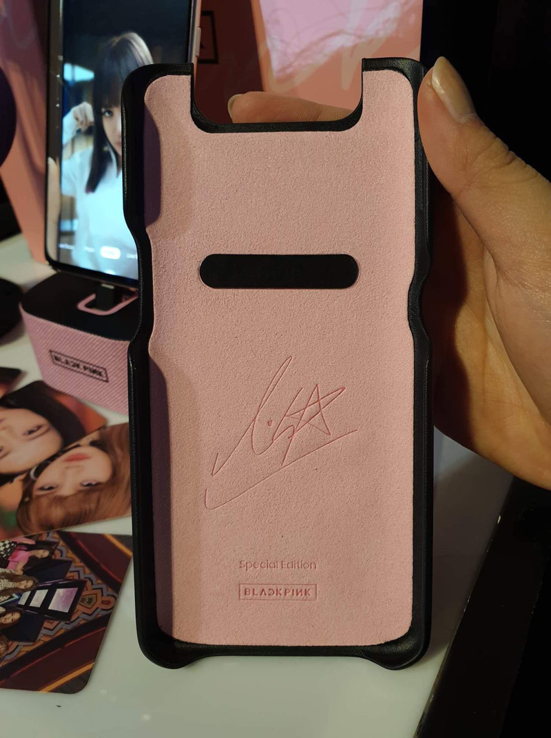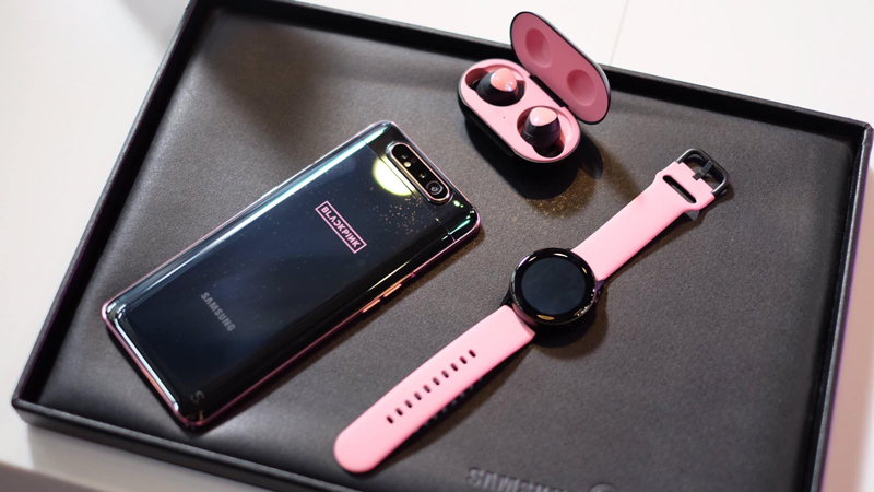 Trọn bộ sản phẩm này bao gồm Galaxy A80, Galaxy Buds, Galaxy Watch, đế sạc và một chiếc ốp lưng có kèm chữ ký của BlackPink và blackpink logo.