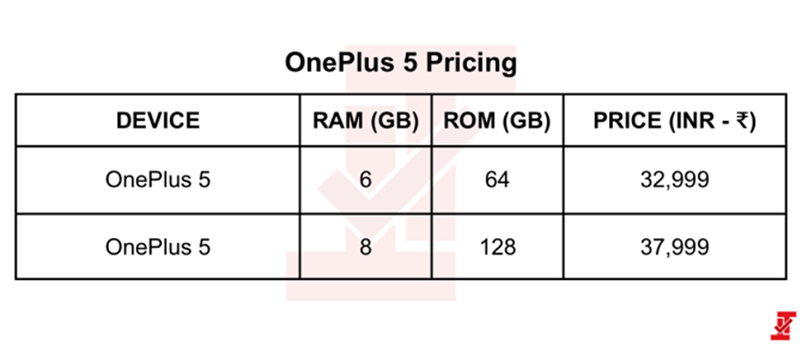 So với những siêu phẩm khác trên thị trường, mức giá của các phiên bản OnePlus 5 được cho là khá dễ chịu. Cụ thể, OnePlus 5 sẽ có tùy chọn 2 phiên bản. Phiên bản RAM 6GB, bộ nhớ trong 64GB có giá 32.999 Rupee (~11.6 triệu đồng). Phiên bản cao cấp hơn sẽ có 8GB RAM, 128GB ROM với giá 37.999 Rupee (~13.4 triệu đồng).