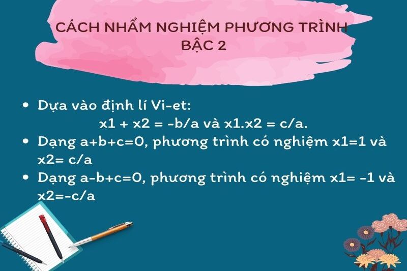 Đây là phương pháp giải phương trình bậc 2 dựa trên việc nhận biết một số dạng đặc biệt của phương trình bậc 2. Nó được áp dụng theo một định lý quen thuộc, đó chính là định lý Vi-et. Phương pháp nghiệm là một phương pháp nhẩm nhanh được nghiệm mà không cần sử dụng công thức nghiệm. Một số dạng phương trình bậc 2 có thể nhẩm nghiệm như sau: