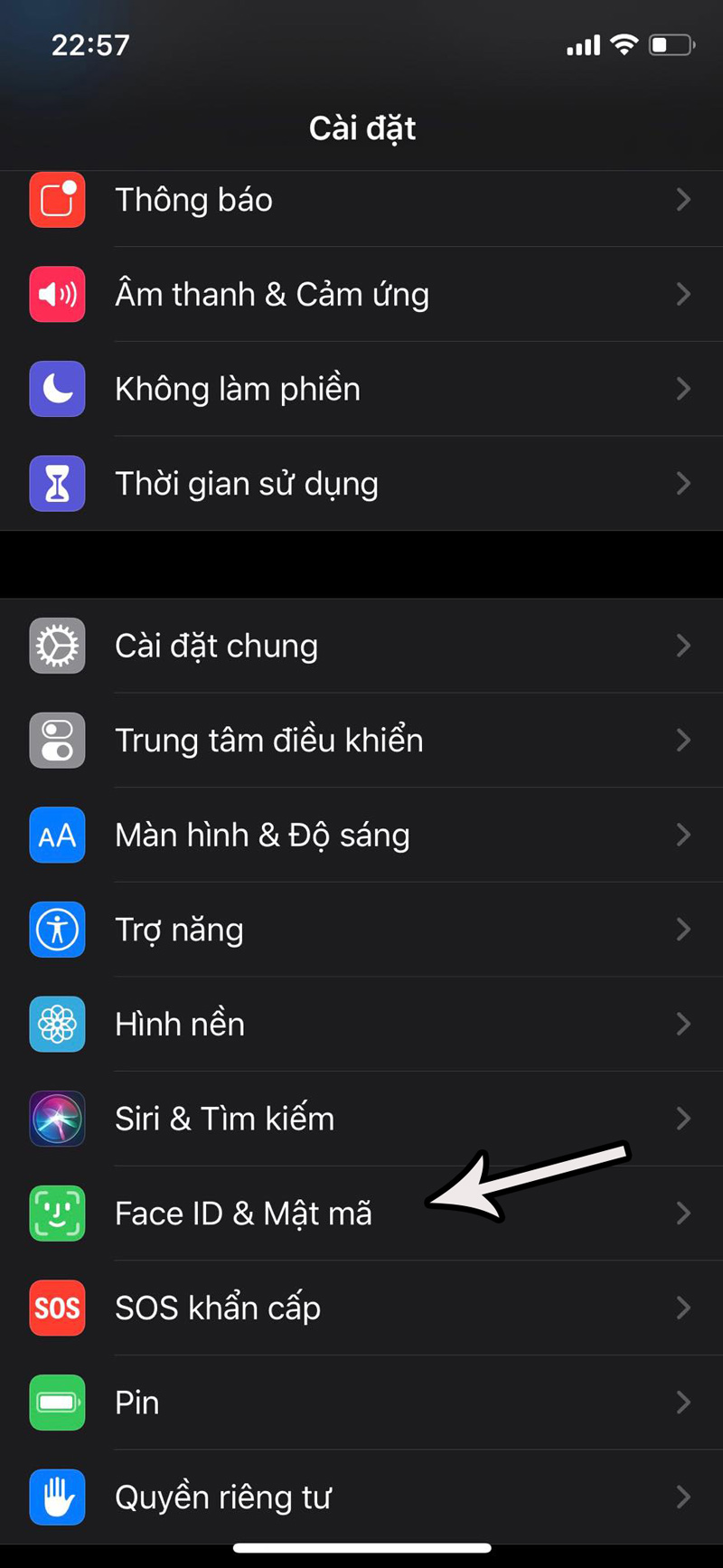 2. Kéo xuống chọn vào Face ID & Mật mã.