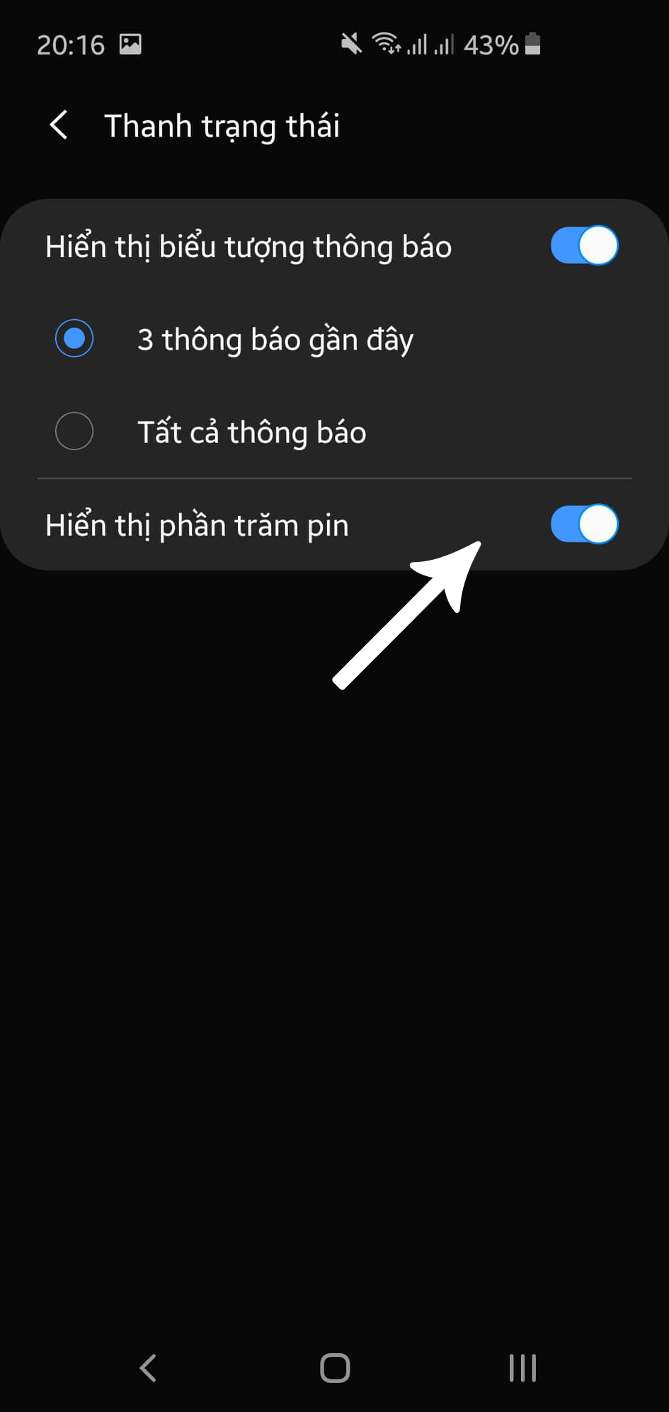 - Gạt sang phải để bật Phần trăm pin