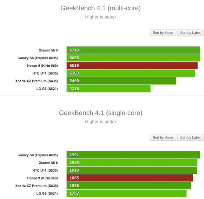 Cụ thể, điểm hiệu năng đơn lõi của Honor 9 đạt 1.865 điểm. Con số này đủ để vượt mặt những flagship như LG G6 hay Sony XZ Premium. Còn về điểm đa nhân, Huawei Honor 9 đạt 6.519 điểm. Với điểm số cực khủng này, Honor 9 dễ dàng đánh bại những đối thủ sừng sỏ như HTC U11, G6 và XZ Premium.