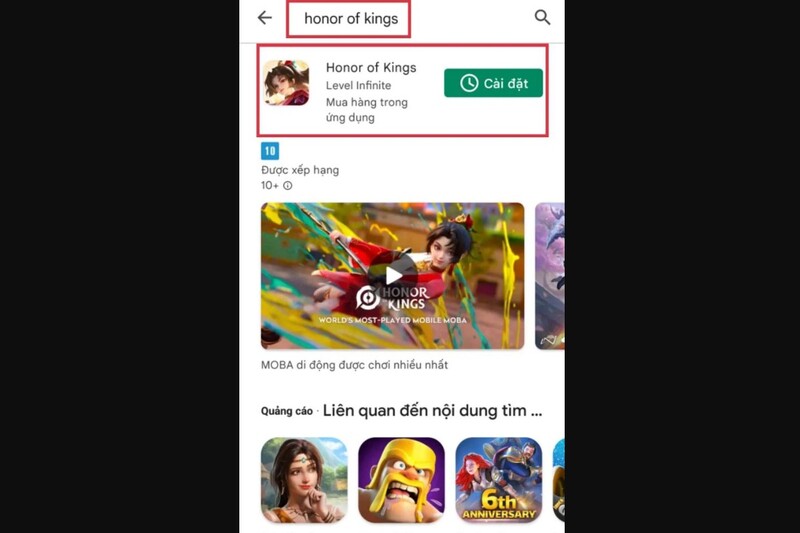 Bước 4: Tìm kiếm Honor of Kings APK trong Google Play Store và nhấn cài đặt và chờ đợi quá trình tải xuống hoàn tất.