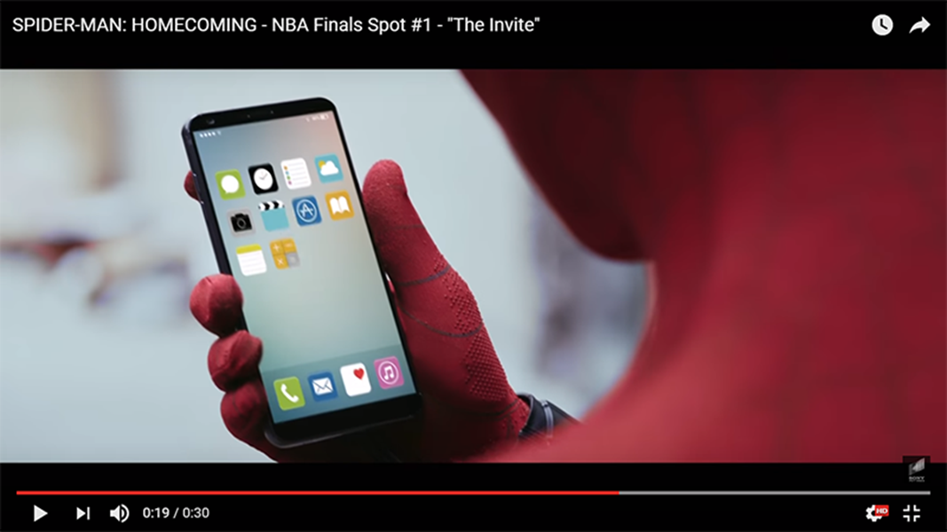Ở giây thứ 19 của trailer, Người Nhện đã dùng một chiếc smartphone với giao diện iOS để xem vé mời vừa được gửi tới từ Người Sắt. Người xem có thể dễ dàng đoán được đó là một chiếc iPhone nhưng lại có thiết kế mới lạ giống như những hình ảnh rò rỉ xuất hiện trên mạng. Do đó, nhiều người dự đoán rằng đó chính là chiếc iPhone đặc biệt kỉ niệm 10 năm của Apple.