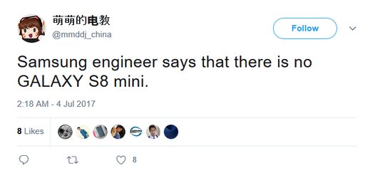 Trên mạng xã hội Twitter, một kỹ sư của Samsung đã bác bỏ tin đồn về Galaxy S8 Mini. Nguồn tin này rất đáng tin cậy từ trước tới nay bởi đây là một kĩ sư tham gia phát triển smartphone của Samsung.
