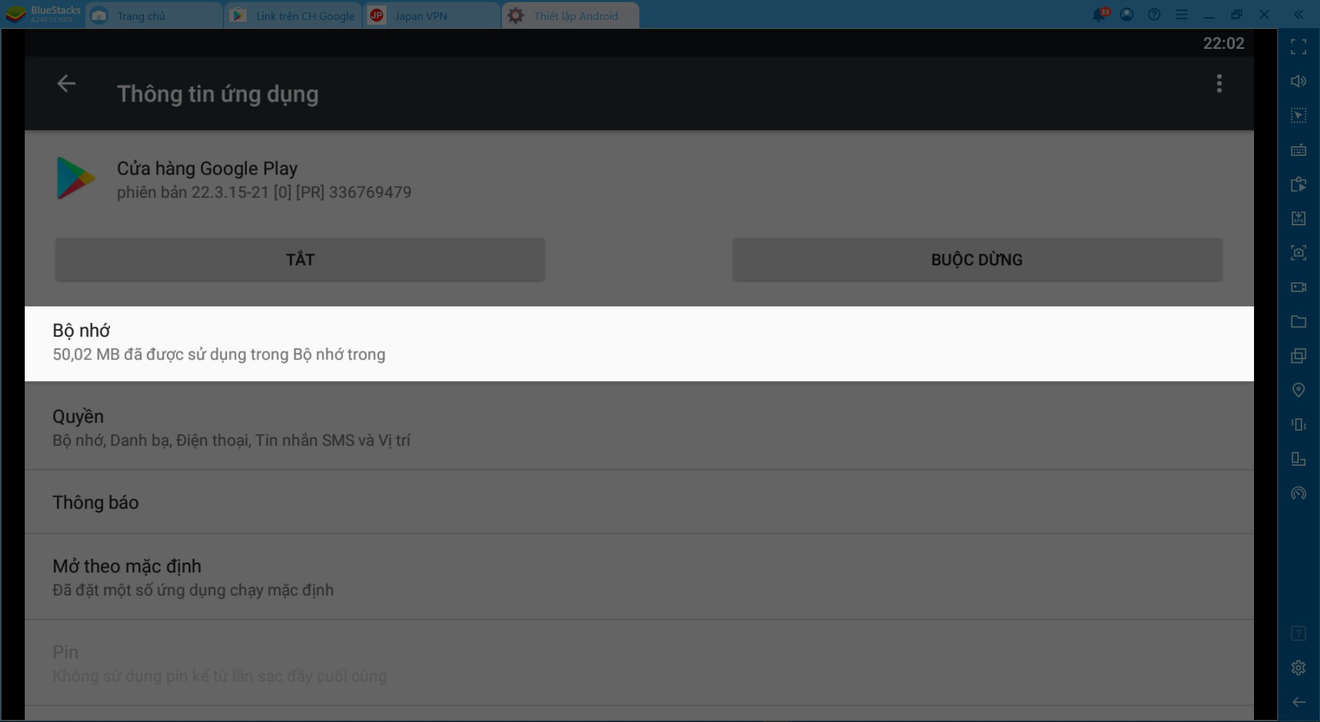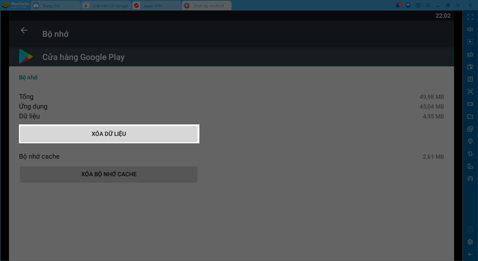Chọn Apps >> Cửa hàng Google Play >> Bộ nhớ >> Xóa dữ liệu.