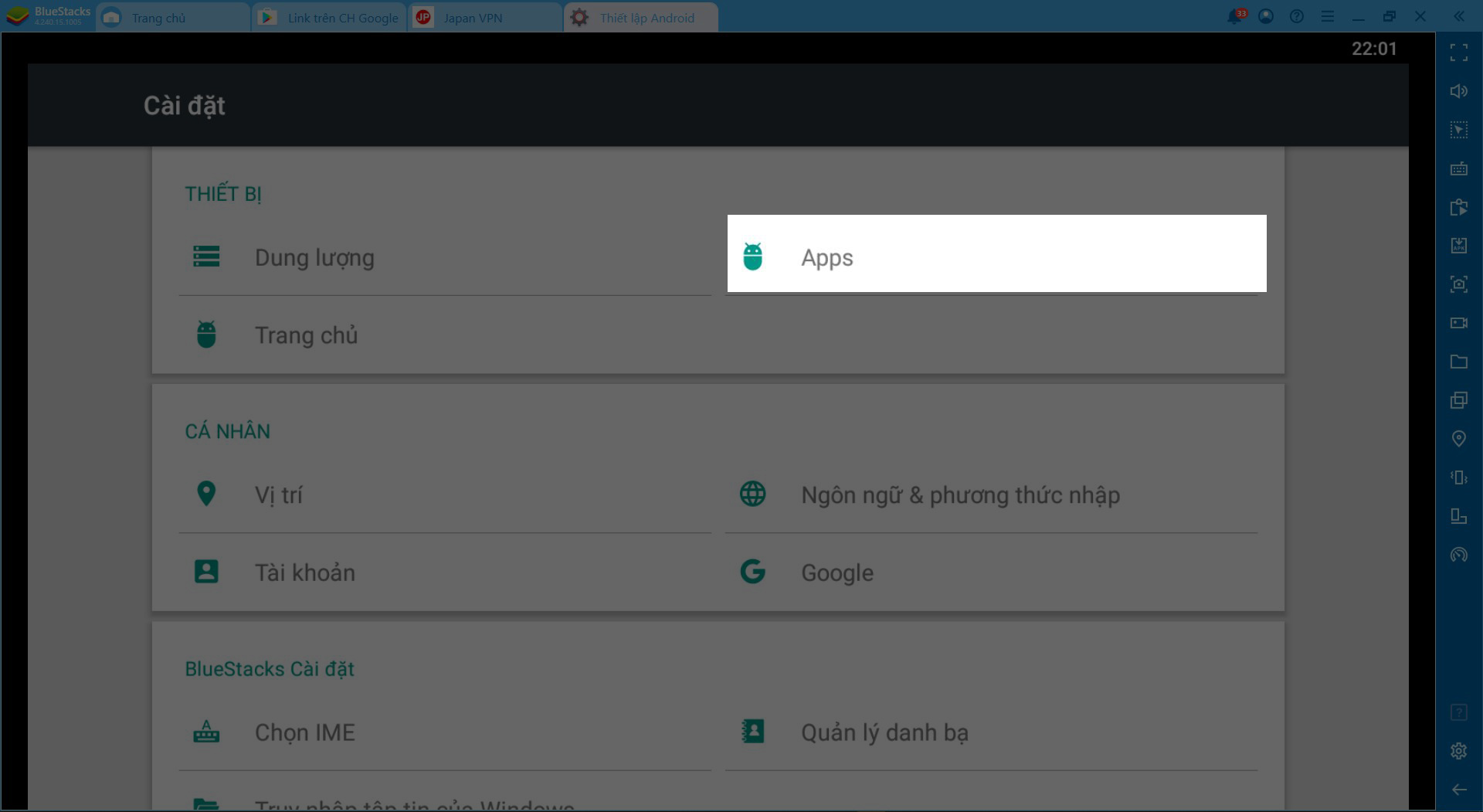 Bước 5: Tiếp đó, bạn hãy quay lại Trang chủ >> chọn Ứng dụng hệ thống >> Thiết lập Android.