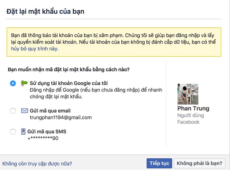 Tiếp theo, chọn các phương thức lấy lại mật khẩu có thể bằng tài khoản Google, Email hoặc cả số điện thoại.