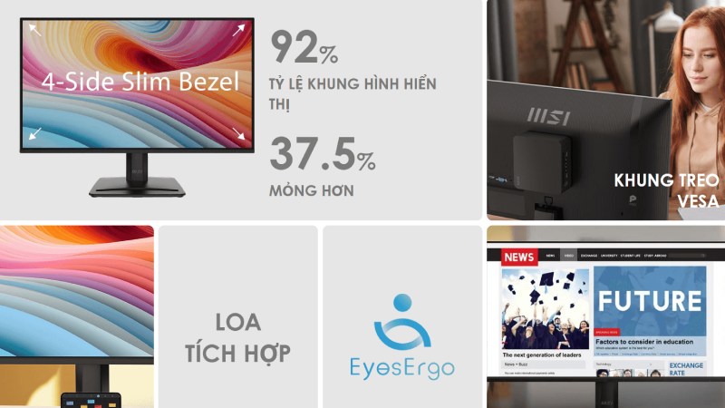 Điển hình là MSI EyesErgo – một công nghệ được MSI tích hợp vào các sản phẩm màn hình của mình, đặc biệt là dòng màn hình chuyên dụng cho văn phòng và làm việc. Công nghệ này tập trung vào việc bảo vệ mắt người dùng, giúp giảm mỏi mắt và tăng cường trải nghiệm làm việc trong thời gian dài.