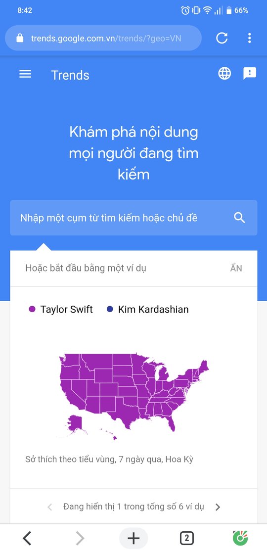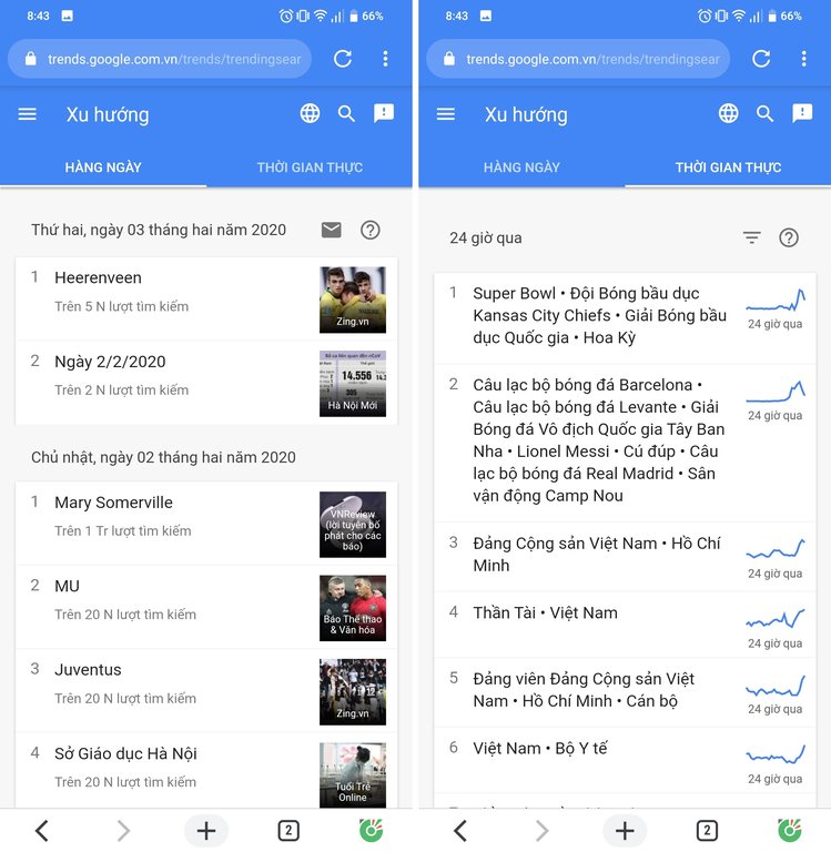 Bước 3: Ngay khi mở mục Tìm kiếm thịnh hành, bạn sẽ thấy ngay hai phần nổi bật, một bên là xu hướng tìm kiếm theo ngày và một bên là xu hướng tìm kiếm theo thời gian thực.