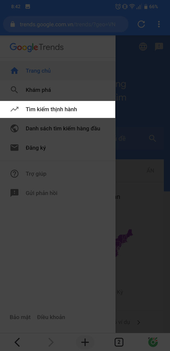 Bước 2: Bấm vào biểu tượng 3 dấu gạch ngang phía trên góc bên trái của màn hình >> Ấn vào Tìm kiếm thịnh hành.