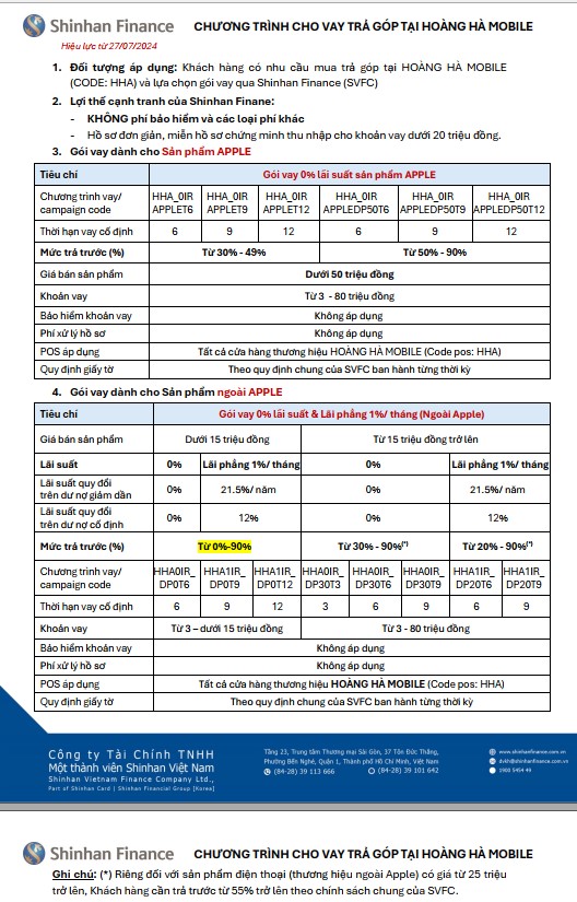 | Lãi suất ưu đãi: theo quy định các gói vay lãi suất 0% và các gói lãi suất thấp đã được ký kết giữa Hoàng Hà và Shinhan Finance | |