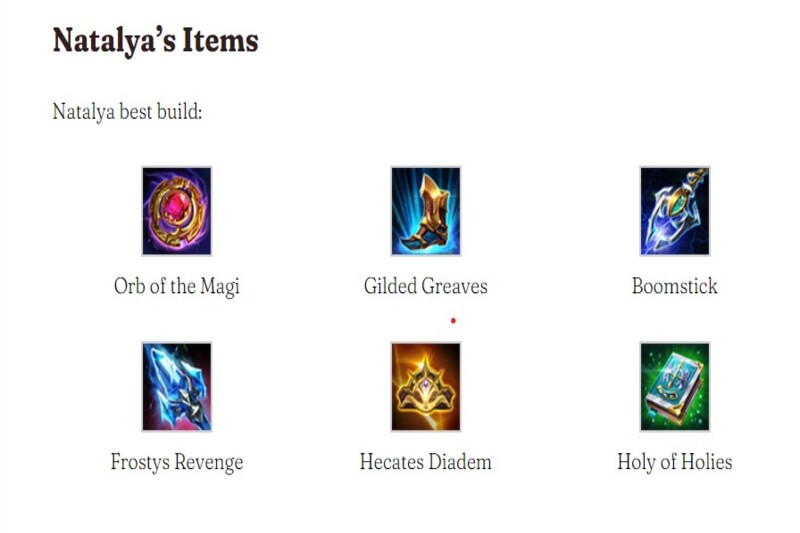 Trang bị phù hợp: Natalya có nhiều lựa chọn trang bị phù hợp với lối chơi của mình. Một số trang bị phổ biến cho cô là Ngọc Đại Pháp Sư, Giày Phù Thủy, Trượng Bùng Nổ, Trượng Băng, Vương Miện Hecate và Sách Thánh. Những trang bị này giúp cô tăng mạnh công phép, giảm hồi chiêu và hút máu phép.