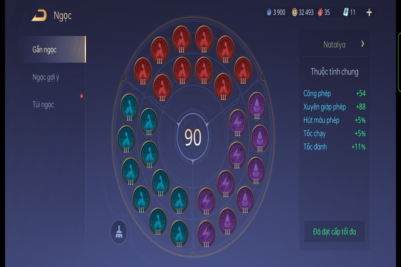Ngọc đỏ: Nên chọn những loại ngọc III công phép để tăng 10 công phép cho mỗi ngọc, tổng cộng 90 công phép.