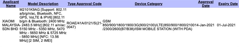 Chứng nhận SIRIM tiết lộ Xiaomi Mi 11 Lite có số model M2101K9AG và sẽ rộng đường quốc tế. Điện thoại hỗ trợ Wi-Fi 802.11ac, NFC và VoLTE. Mặt khác, chứng nhận Bluetooth xác nhận số model M2101K9AG được liên kết với Mi 11 Lite và hỗ trợ kết nối Bluetooth 5.2.