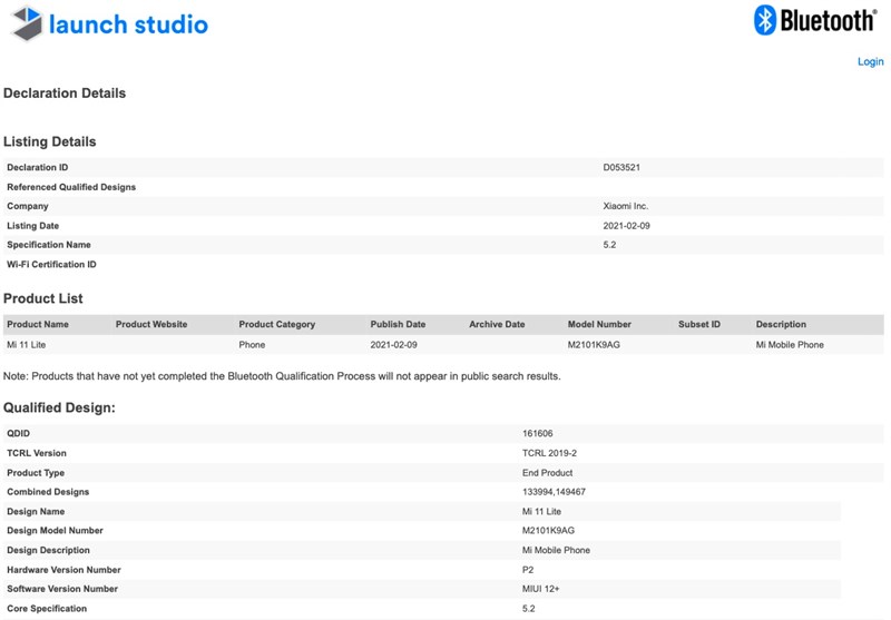 Thông tin về Xiaomi Mi 11 Lite được tiết lộ trên cơ sở dữ liệu của cơ quan SIRIM và Bluetooth SIG