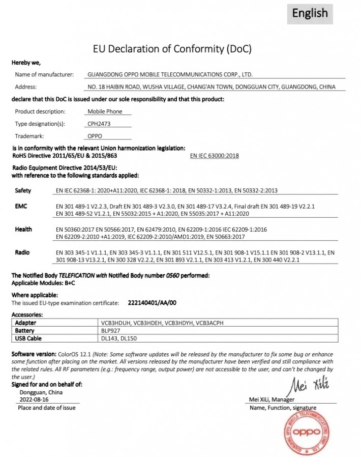 Sản phẩm này đã được chứng nhận ở ba thị trường khác nhau ở các khu vực khác nhau – Thái Lan, Ấn Độ và Liên minh Châu Âu. Đây là thiết bị có số model CPH2473 và NBTC, và cơ quan quản lý Phát thanh và Truyền thông Thái Lan cũng đăng tên cái tên Oppo A77s. Oppo A77s đã được cấp phép kinh doanh ở Liên minh Châu Âu, và máy sẽ chạy Color OS 12.1, dựa trên nền tảng Android 12.
