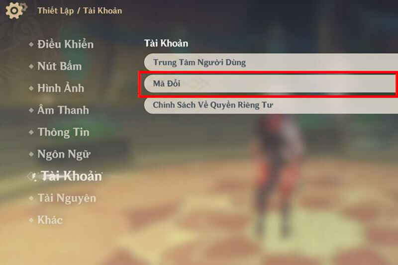 Bước 2: Chọn “Tài khoản” (Gift) và chọn “Mã đổi” (Redeem Code).
