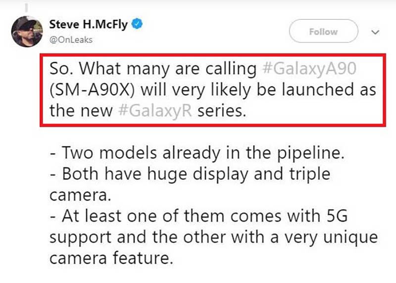 Theo thông tin mà Gizchina cho biết thì Galaxy A90 có tên mã là SM-A908N và vẫn đang được thử nghiệm tại quê nhà Hàn Quốc. Một nguồn tin giấu tên khác cho biết Galaxy A90 vẫn sẽ ra mắt, nhưng sẽ được “thay tên đổi họ” thành Galaxy R. Dự kiến, đây cũng chính là tên gọi cho dòng sản phẩm mới mà Samsung trình làng và nằm ở giữa Galaxy A và Galaxy S.