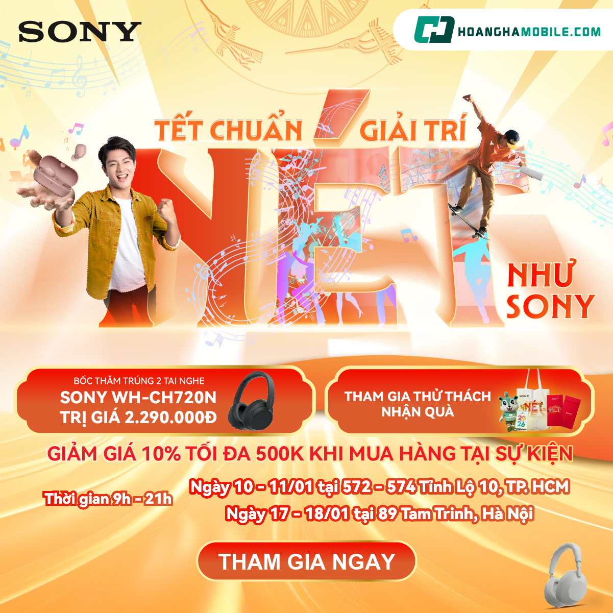 Nhằm mang đến không gian trải nghiệm âm thanh sống động từ các sản phẩm Sony, Hoàng Hà Mobile tổ chức Sony Sound Fest trong 2 ngày 10–11/01 tại Hoàng Hà Mobile 572–574 Tỉnh Lộ 10, TP. HCM và 89 Tam Trinh, phường Vĩnh Tuy, Hà Nội. Tại đây, khách hàng không chỉ được trực tiếp trải nghiệm hệ sinh thái âm thanh Sony mà còn có cơ hội nhận nhiều phần quà hấp dẫn. Chi tiết xem tại bài viết này.