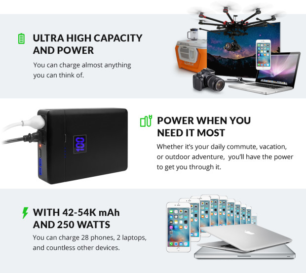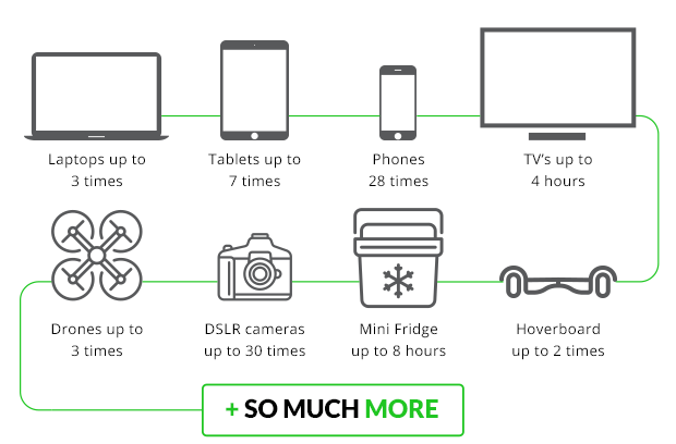 Thiết bị có thể sạc cho một chiếc smartphone trung bình 28 lần, tablet lên tới 7 lần, laptop và flycam lên tới 3 lần, ván trượt tự cân bằng lên tới 2 lần!
