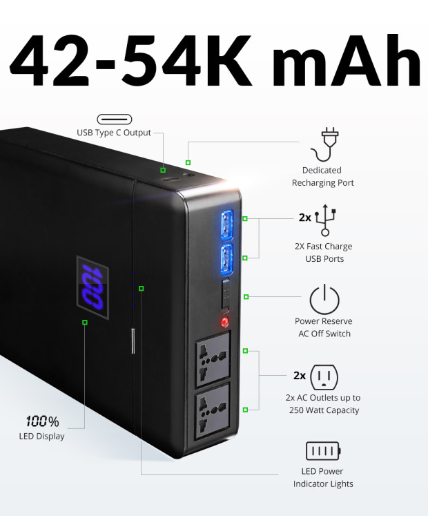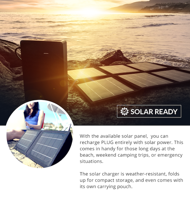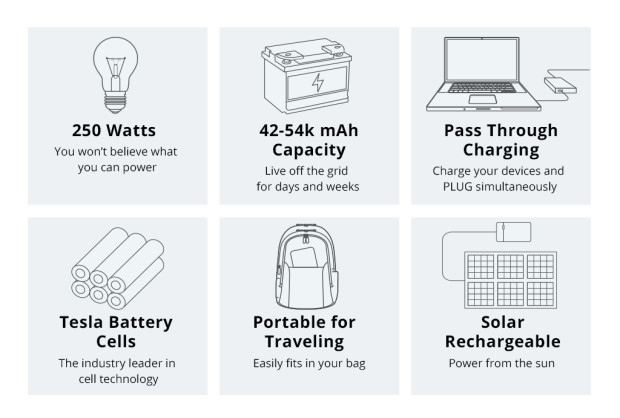 Bộ sạc sở hữu hai ổ cắm AC (dòng điện xoay chiều), hai cổng USB truyền thống và một cổng USB Type-C. Thiết bị cũng cho phép sạc lại bằng năng lượng mặt trời và chỉ mất khoảng 8 giờ để bạn lại tiếp tục có 48000mAh để bạn tiếp tục sử dụng. Bên trong bộ sạc là 16 viên pin Panasonic với mỗi viên có dung lượng 3000mAh, cùng loại thường được sử dụng bên trong các chiếc xe Tesla, hãng xe ô tô điện nổi tiếng thế giới. Mặc dù mang dung lượng lớn đến vậy, ChargeTech PLUG chỉ có kích thước 8.6 x 1.6 x 5.6 inch (21.8 x 4.1 x 14.2 cm) và khối lượng chỉ 907.2 gram, tức chưa đến một kilogram. Vì vậy, bạn có thể mang thiết bị này bên trong bất cứ chiếc balo nào mà không sợ bị “gãy lưng”.