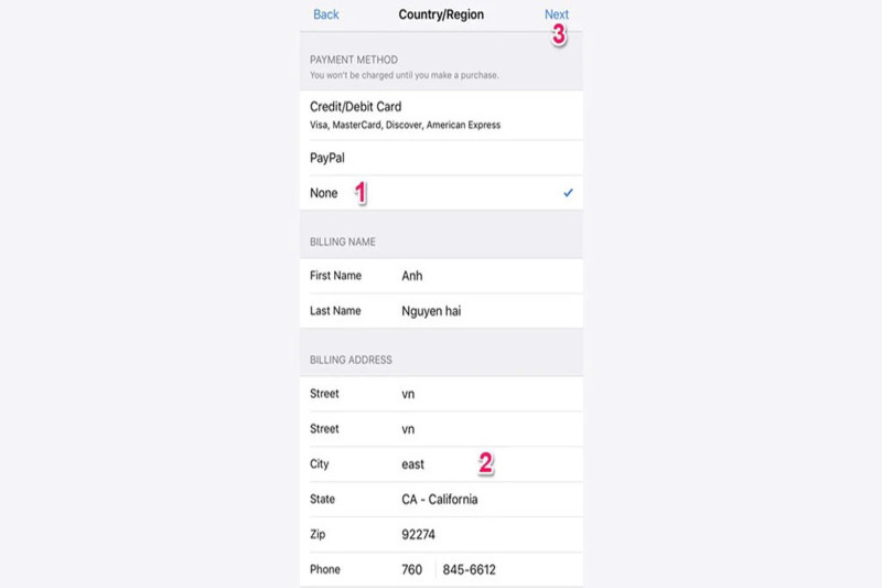 Bước 3: Đồng ý với các điều khoản và điền đầy đủ thông tin cá nhân, địa chỉ và số điện thoại. Chú ý chọn phương thức thanh toán là None.