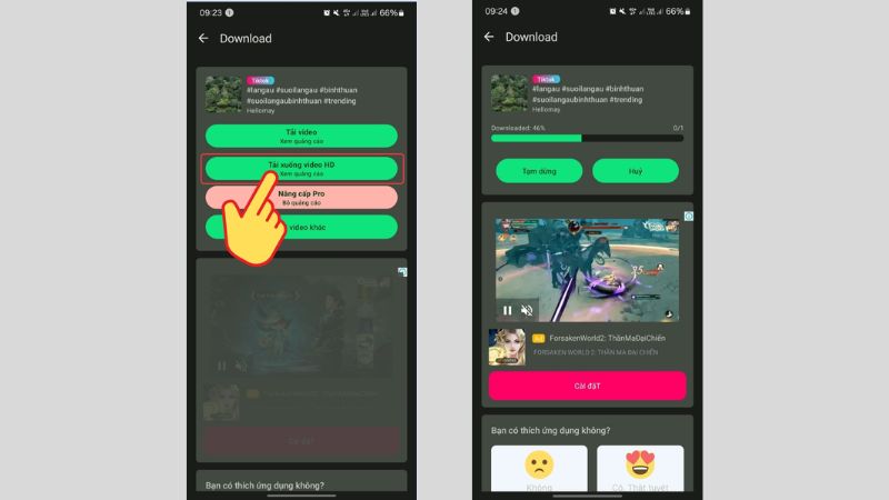 Bước 4: Chờ đợi vài giây, lúc này màn hình sẽ hiển thị các lựa chọn khi tải xuống video, bao gồm Tải video và Tải xuống video HD. Bạn có thể lựa chọn Tải xuống video HD để chất lượng và độ sắc nét của video được đảm bảo hoặc chọn Tải video nếu như không yêu cầu cao về chất lượng hay bộ nhớ điện thoại hạn chế. Cả hai tùy chọn đều yêu cầu xem quảng cáo.
