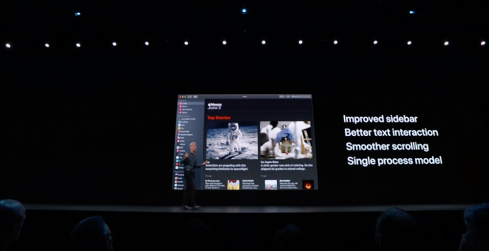 - Apple cũng đang đưa UIKit của mình lên Mac để các nhà phát triển đưa ứng dụng iPad lên Mac nhanh hơn; Dự án Marzipan đã chính thức được đặt tên là “Catalyst”. Apple cho biết trải nghiệm ứng dụng được cải thiện đáng kể so với Voice Memos, News, Home và Stocks được giới thiệu trong Mojave.