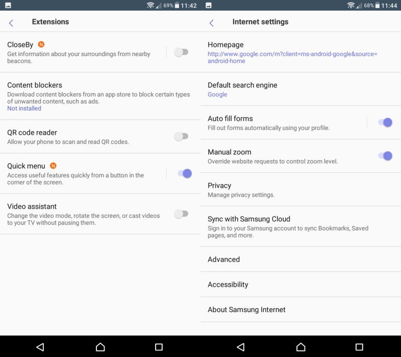 Một số hình ảnh và cài đặt trong trình duyệt Samsung Internet Browser beta
