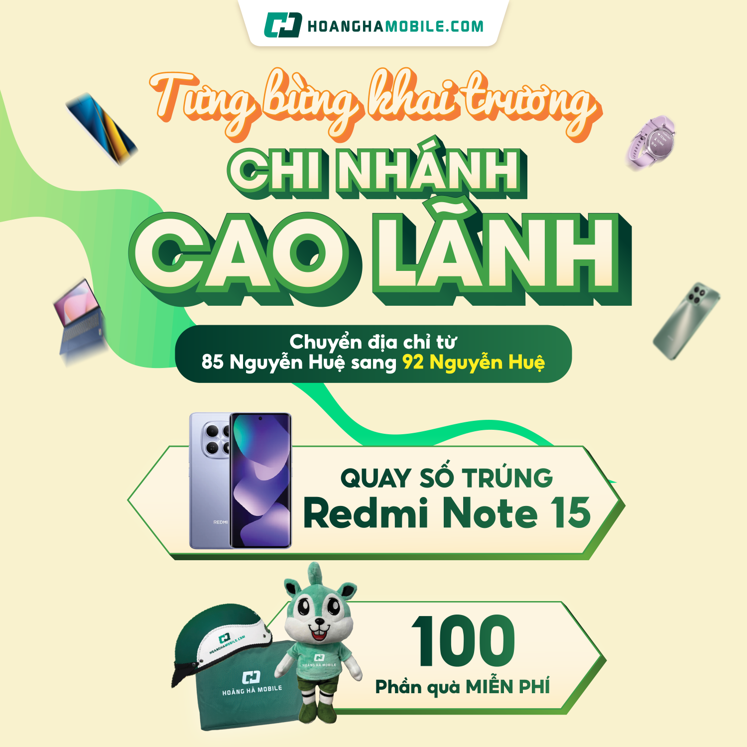 Hệ thống bán lẻ công nghệ Hoàng Hà Mobile chính thức khai trương cửa hàng mới tại 92 Nguyễn Huệ, Phường 1, TP. Cao Lãnh, hứa hẹn mang đến không gian mua sắm hiện đại cho khách hàng cùng hàng loạt ưu đãi khủng: Tặng quà miễn phí 100% cho đơn hàng và cơ hội trúng điện thoại Xiaomi Redmi Note 15.