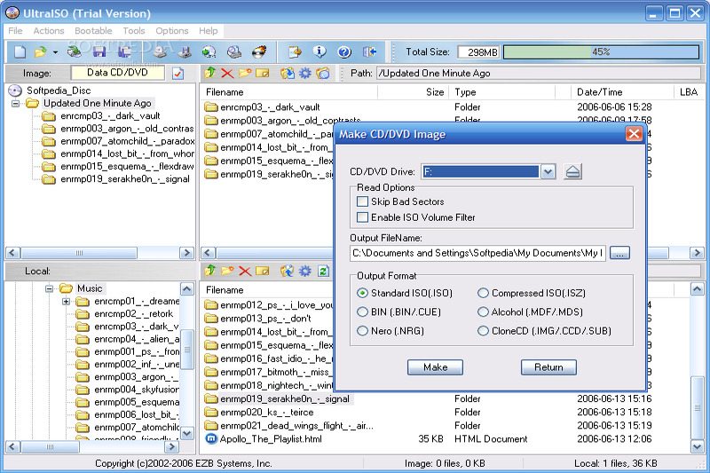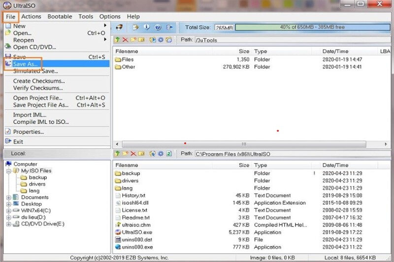 Ổ cứng: UltraISO có thể tạo file ISO trực tiếp từ dữ liệu của ổ cứng. Người dùng có thể kéo thả các file hay thư mục vào cửa sổ phần mềm và chọn menu File -> Save để lưu file.