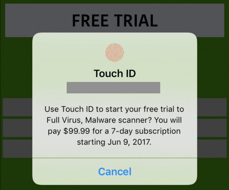 Nếu người dùng cài ứng dụng vào máy thì sao nhỉ? Khi mở ứng dụng, trên màn hình sẽ xuất hiện dòng chữ “This app need to cccess to your Contact to scan your Contact first.” (access viết thiếu chữ ‘a’) để yêu cầu cấp quyền truy cập vào danh bạ của mình. Ứng dụng còn mời gọi mua các phần mềm để quét virus trên thiết bị. Nó lừa người dùng trả 99.99 USD (~2.26 triệu đồng) cho việc đăng kí gói bảo vệ điện thoại vô tác dụng.