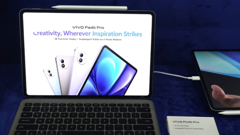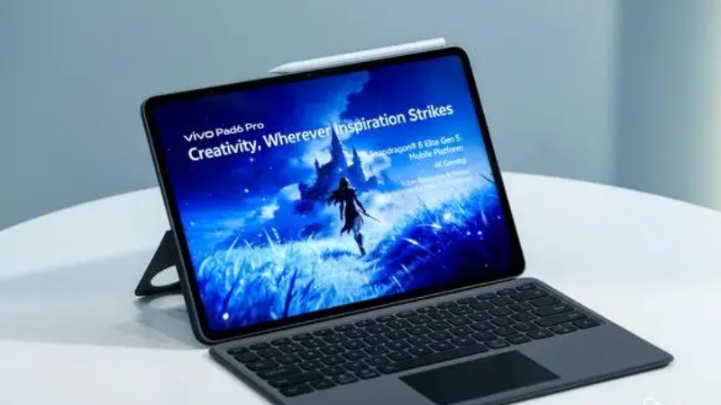 Một tấm thẻ thông số kỹ thuật đặt cạnh máy tính bảng xác nhận các chi tiết phần cứng quan trọng của thiết bị. Nó đề cập đến nền tảng di động Snapdragon 8 Elite Gen 5, báo hiệu sự chuyển hướng sang chipset hàng đầu mới nhất của Qualcomm để mang lại hiệu năng cao cấp. Toàn bộ thiết lập, bao gồm bàn phím từ tính và hỗ trợ bút cảm ứng, cho thấy Vivo đang nhắm đến người dùng tìm kiếm trải nghiệm giống như máy tính xách tay trong một thiết bị máy tính bảng.