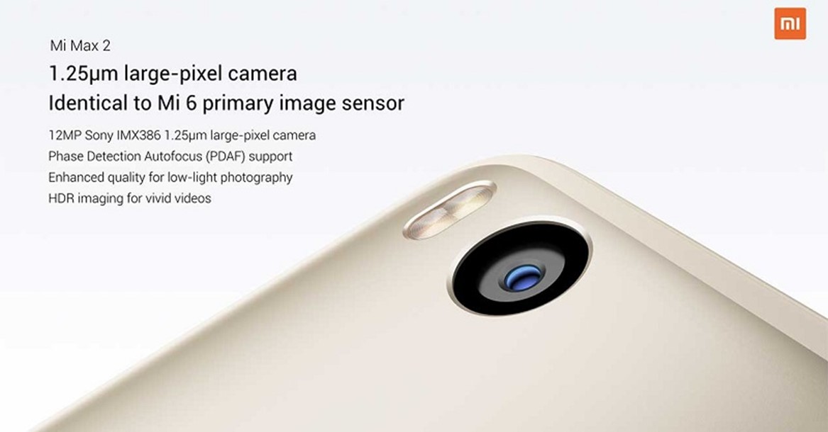 Xiaomi Mi Max 2 sở hữu camera có độ phân giải 12MP với cảm biến Sony IMX386 tương tự như trên chiếc flagship đầu bảng Xiaomi Mi 6 đã từng được ra mắt trước đó. Camera này có kích thước điểm ảnh 1.25 micron và hỗ trợ công nghệ lấy nét theo pha PDAF cùng cụm đèn flash LED kép. Camera trước của máy có độ phân giải 5MP.