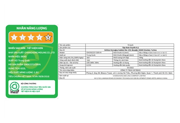 • Công suất tiêu thụ công bố theo TCVN Đang cập nhật
