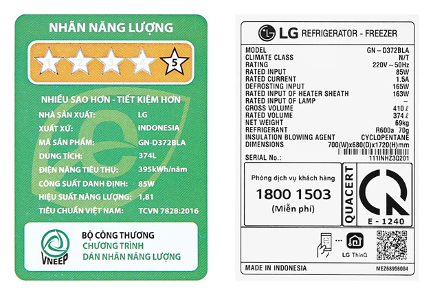 Tủ lạnh LG Inverter 374 lít GN-D372BLA không chỉ ghi điểm nhờ thiết kế sang trọng và dung tích rộng rãi, mà còn được đánh giá cao về khả năng tiết kiệm điện năng. Theo công bố từ nhà sản xuất dựa trên tiêu chuẩn TCVN, tủ có mức tiêu thụ điện chỉ 395 kWh/năm, là một con số lý tưởng cho những gia đình muốn giảm chi phí điện hàng tháng mà vẫn đảm bảo hiệu suất làm lạnh tối ưu.